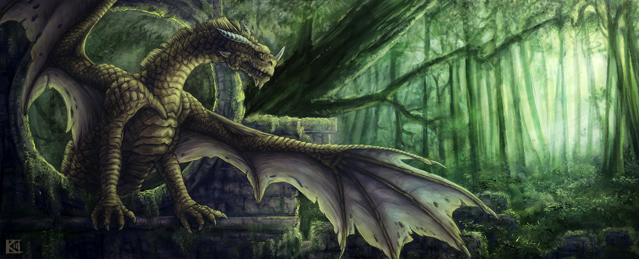Muj prizpevek pro obalku do stolniho kalendare. Draci cestovatel v ruinach zapadlych v hustem lese.