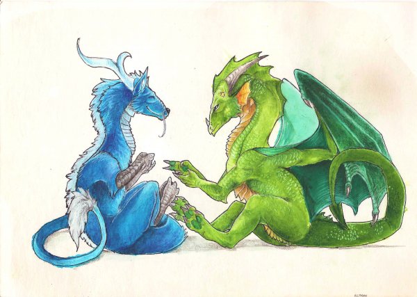| Určite už niekto hral túto hru ,, kameň, papier, nožnice :D Nebola to žiadna prechádzka ružovou záhradou, ale nakoniec sa to podarilo. Čo sa techniky týka, použila som tentokrát vodovky, pastelky Polycolor, biela gelovka a čierne pero. Pokaial vám ten modrý drak bude pripadať ako Elóren, tak verte mi že to nebol zámer :D. Tento obrázok ma inšpiroval pri tejto blbine http://isismasshiro.deviantart.com/art/Epic-duel-151707606 :D tak nech sa vám páči