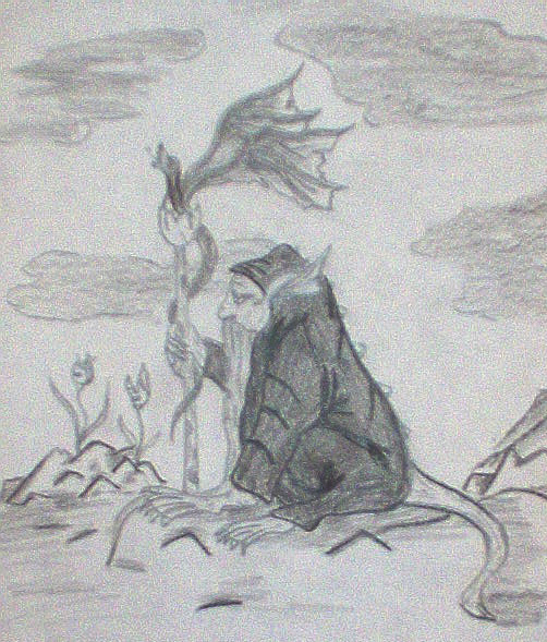 Tak takhle si představuju strážce draků...Není to člověk ani zvíře...má hůl s malým drakem kterého opatruje.Mno spíž je to fantazy...ale aspon ten drak tam je...