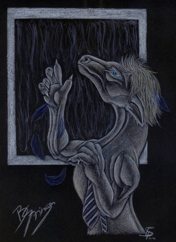 "Černá… barva noci i temnoty, barva mého obleku a nyní i mých snů. Barva tvých perutí… dívám se do nocí ztemnělého okna a v odrazu ve skle sám sobě hledím do očí.