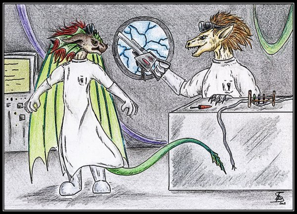 To má být něco takového divného bleskoidního... XD Navíc to má být laboratoř, ale nějak jsem si nemohla vybavit všechny ty serepetičky, co tam vlastně má... možná škoda, kdybych se s tím zkusila vykreslit víc, mohlo to být zajímavější. XD