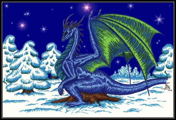 Obrázek kreslený v prosinci, kdy jsem si říkala, jak by bylo pěkné, kdyby napadl sníh. Nudila jsem se a našla jsem zas jednou fixy, a tak vznikl dráček (lehce obtloustlý) sedící na pařezu a kochající se zimní krajinou.