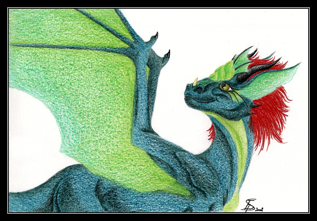 Jo a mimochodem, to ani nepoznáš mou zelenou? Tahle není moje... moje jen ta světlá tam, kde mají být hrudní pláty (nešly mi nakreslit), z části na křídlech, na čelních šupinách a ta blanka u oka, ta je taky po mě. ;o)