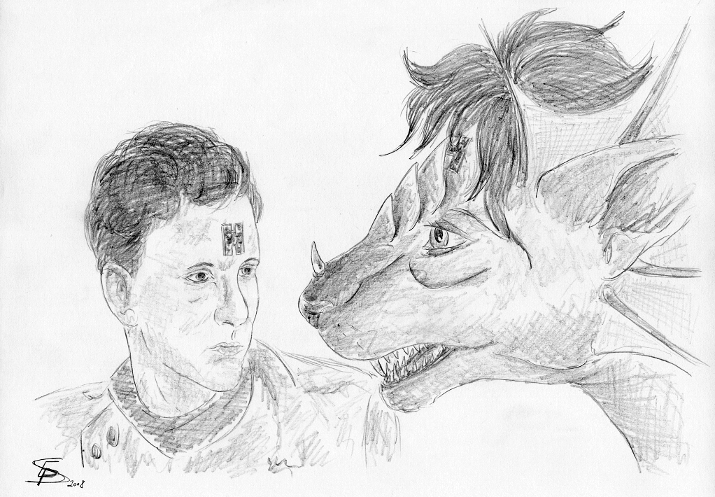 Vesměs se Ti to nezdá, pomladila jsem ho proto, že jsem ho kreslila podle jednoho screenshotu, který jsem si udělala tuším ze 3. série. ;oD Tam měl totiž tu pěkně zelenou uniformu, takže i když to mám kreslené černobíle tužkou, vím, že s předlohou ladím. XD
