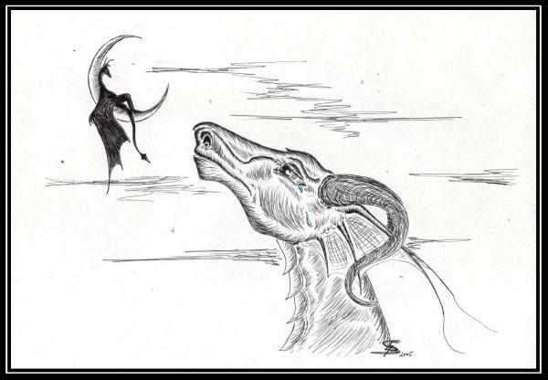 Jemné stínování, naprosto všeříkající výraz. Opravdu, velmi emotivní a zároveň o to hezčí. Dobře jsi vychytala i pozadí, kdyby tam bylo čar víc, není to přehledné, takhle to je však akorát. Tmavý drak na měsíci dodává všemu ten pravý dojem. Skutečně, víc říct nejde.
