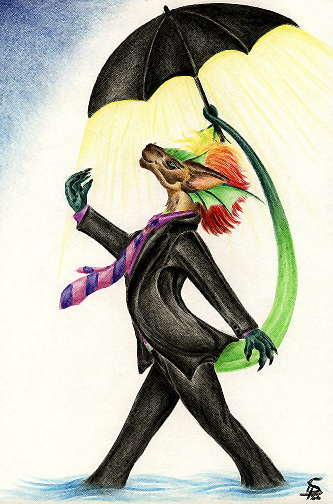 Njnj, má samolibost asi nezná mezí, co? Původně z toho mělo vzniknout něco trochu jiného, ale když jsem tak viděla tu pózu, co jsem si nakreslila a nevěděla, co s ocasem, z ničeho nic mi bleskl hlavou deštník. Ač teda normálně i v tom největším dešti deštníky nenosím. Ale... tady by mi zmokl oblek, pravda... XD No a proč z toho deštníku neudělat zářící světlo, které dopadá na mou úžasnou pompézní maličkost?