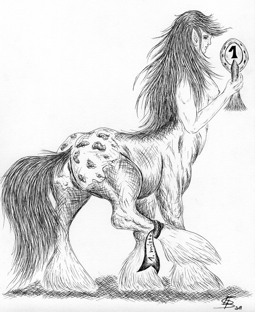 Můžeš laskavě svou kritiku formulovat poněkud mírněji? Anatomických nesrovnalostí jsem si vědoma, jen tak od ruky nekreslím lidi zrovna často. Na lidskou část jsem neměla vůbec žádnou předlohu, takže jsem ráda, že jsem nakreslila aspoň něco. Ucho je velké schválně, možná moc široké, ale mělo být prostě větší než lidské. Nevím proč, ale prostě to tak u kentaurů kreslím. A abys věděla, prvně začínám kreslit tužkou, obtahuju až pak a to co není vidět (např. pod vlasy) si slabě načrtávám, takže radit, jak má jeden postupovat, bys měla, až si zjistíš, jak vlastně dotyčný kreslí.