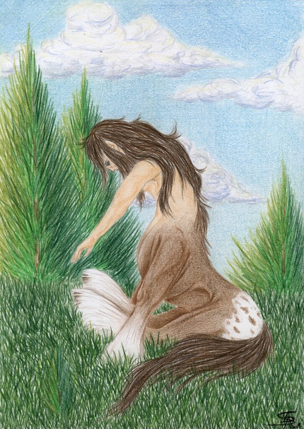 Polohu jsem nakonec nějak načrtla, ale až pozdě jsem zjistila, že lidská část by měla být poněkud menší či ta koňská větší, a nakonec jsem to ještě dost zkazila tím pozadím. Viděla bych Yeyru spíš sedět na nějakém polštářku, jenže... neumím kreslit polštářky... :o/ A jen malá plošinka trávy vypadala divně, tak jsem zatravňovala dál a dopadlo to takhle...