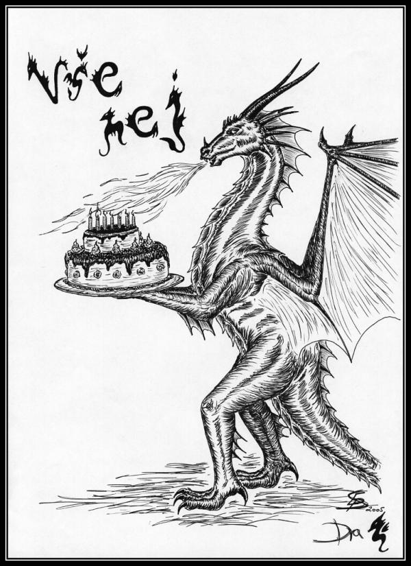 Je možný, že jsi to viděla na sletu, ale mám pocit, že když jsi tu byla, tak jsem s sebou desky s obrázky neměla. Sem jsem ho nedávala určitě, ale trochu se jednomu mýmu podobá, tak třeba Ti ho to připomnělo (neumím moc kreslit draky na zadních v jiné poloze, než v týhle). A možná jsem Ti ho taky posílala soukromě, protože když jsem ho tenkrát kreslila, byla jsem s Tebou na ICQ a nadávala Ti, že kvůli Tobě dělám chyby - právě ten křivý dort.