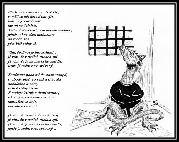 Were: Napíšu sem to, co Tobě do vzkazu, protože i ostatní by to třeba rádi věděli - co když je nechci uvolnit? Proč je tam to slovní spojení "zlatá kazajka"? Zlatá je honosná a příjemná barva, bezpečná barva. Kazajka je sice stahující a beroucí svobodu, jenže jsme součástí ona i já. Ta kazajka mě svírá, ale i drží. Nenávidím jí, ale stejně jí miluju. Nechci jí a stejně si jí dobrovolně oblékám. Skrývám jí, ale chlubím se s ní. Já jí neberu nijak zle, protože svírá, ale neškrtí. Drží mě pohromadě. To spíš ty bílé zdi a mříže jsou pro mě zlé, ale i s tím si umím poradit. Jen se vždy musím dostat přes to smutné - to, co je zde zachycené...