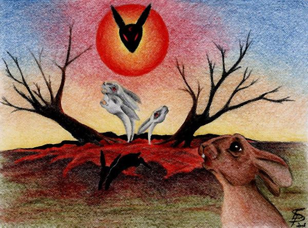 "Já nevím, co to je," přiznal nešťastně Pětík. "V téhle chvíli nám tu nehrozí nic. Ale blíží se to - pořád se to blíží. Ach Lískáči, podívej! Koukni na ten palouk! Je samá krev!"