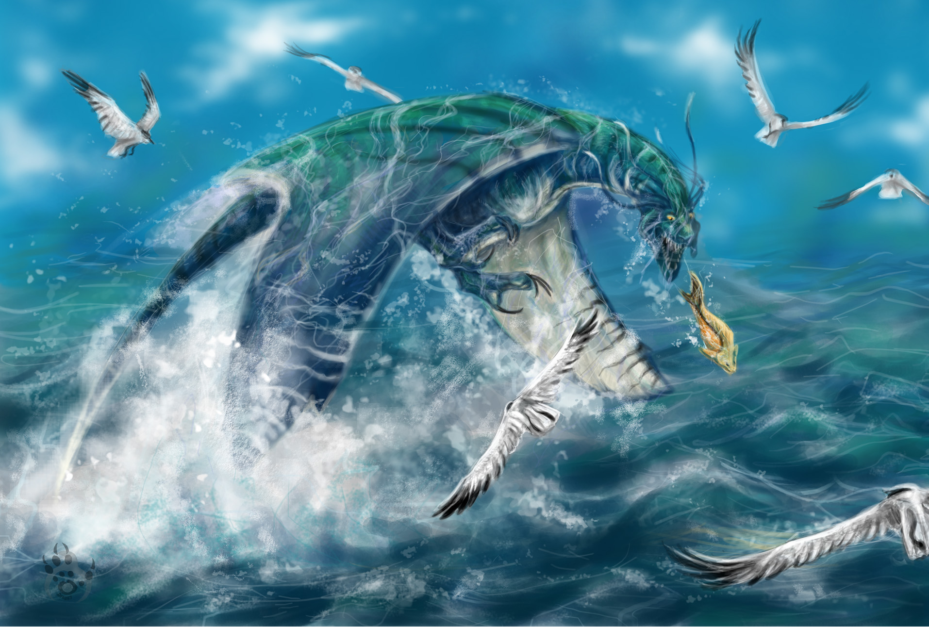 Tak, tenhle potvor vznikl kvůli už dokončené mutaci vlaštovky nebo podobného ptáčka a draka. Začalo mě bavit mixovat rysy dračí spolu s rysy zvířat naší modré planety, takže tento obrázek - Mantodrak - je vlastně pokračováním mini série. Navíc jsem ještě vodu digitálně ani nedělala, natož pak vlny a rozstřikující se pěnu. :D Snad jsem ale docílila jakés takés živosti, kterou měli dodat i ( ne zrovna povedení) racci.