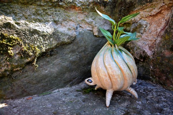 Poněkud prazvláštní dráček cibuláček. Tento exemplář má velikost cca 15 cm a jeho tělíčko je zdobeno sítí drobných prasklinek a nazelenalými tóny. Je vyroben z točírenské hlíny. Možné do něj umístit dlouhostonkaté květinky nebo slaměnky.