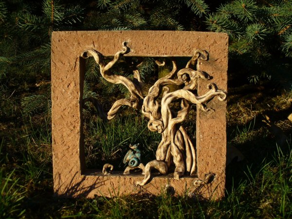 Vyrobeno z hlíny jemné zrnitosti, barveno oxidem a barvou po výpalu. Velikost cca 30x30 cm. Hluboký reliéf k pověšení.