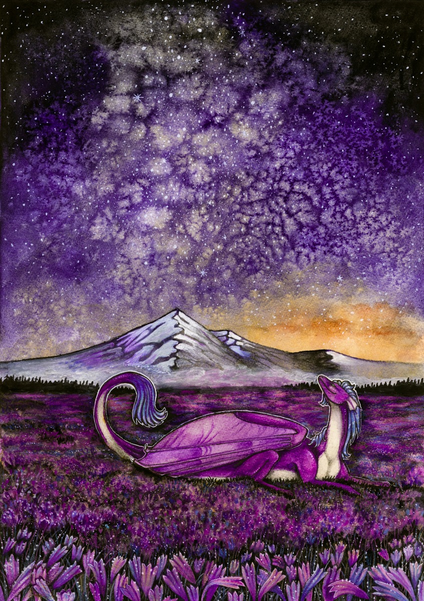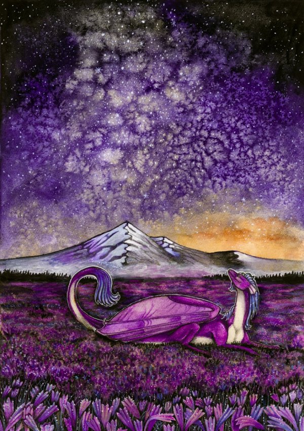 Zakázka pro Drageu. Zadání bylo Dragea ležící na louce s fialovými/modrými kytičkami pod hvězdnou oblohou.