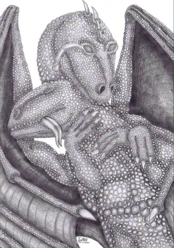 Obrázek sám je moc hezký a draci jsou... no, zkrátka atmosféru jsi vystihla. Šupinky byh tam klidně nechala (obrázek potom vypadá propracovaněji), akorát i přes šupiny musíš dodržet stínování - neboj se více ztmavit celou plochu tam, kde je ve stínu - draci pak mnohem lépe vyniknou. Jen tak dál