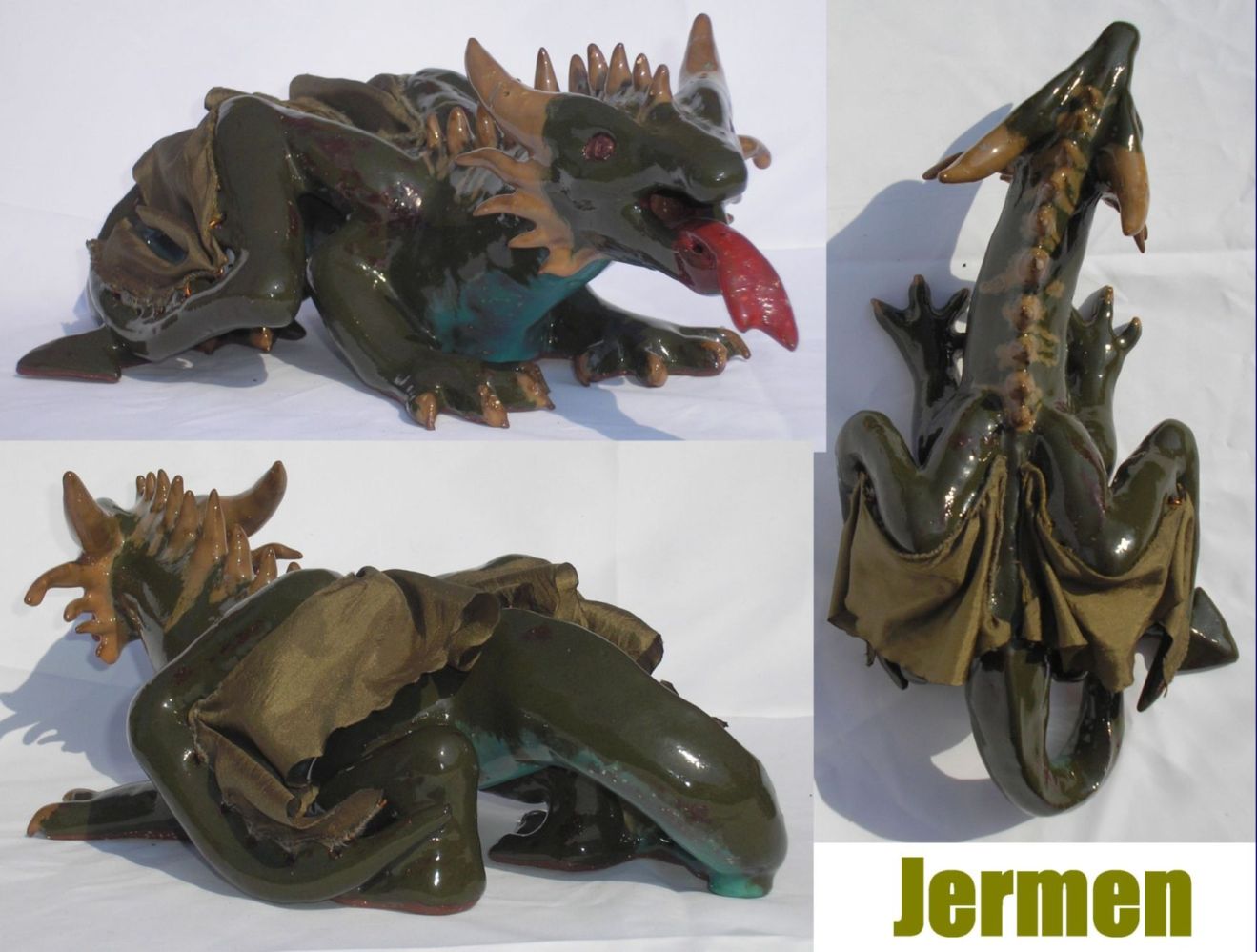 Tak tohoto draka jsem dělala na konci školního roku v prváku, kdy jsem neměla zrovna co dělat. Jenže pak se práce na ním prolívala ještě se zadanou prací. Nevím jak mě napadlo jméno Jermen, pojmenovala jsem ho už během práce a všichni mu pak jinak neříkali. Měla jsem co dělat, abych ho vůbec stihla dodělat. Čas mě neustále tlačil, pospíchala jsem. Učitelka přišla s nápadem že bych mu mohla udělat křídelní blány z látky. Nápad se mi moc líbil jednak protože mi to připadalo zajímaví a jednak jsem už neměla čas dělat se s blánami z keramické hlíny. Naštěstí jsem to stihla a přes velká prázdniny schnul. Ve druháku jsem ho naglazovala. Přitom se mi podařilo ulomit mu asi tři drápky. Jak jsem pospíchala v prváku s jeho dokončením, udělala jsem na něm několik chyb, které jsem zjistila během dokončovacích prací například drápky a křídla, kde chyběli některá očka a já je musela nahradit drátkem. Teprve letos o prázdninách což bylo 19.8 jsem ho konečně dodělala.