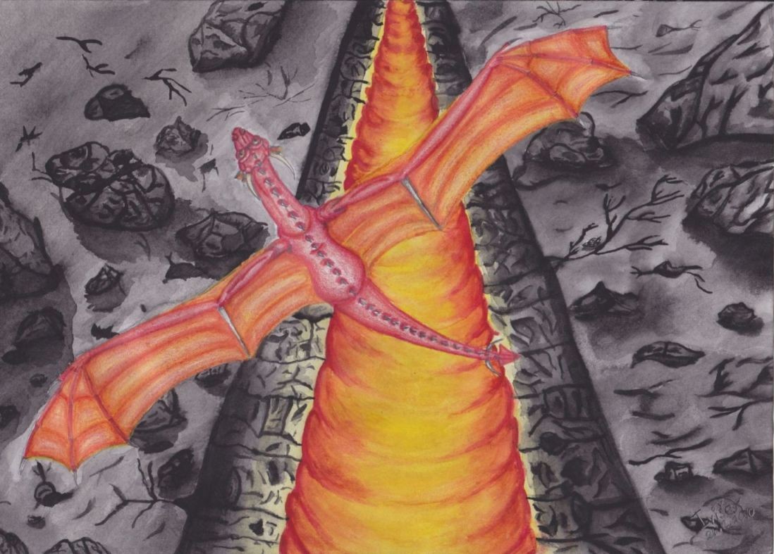 . No stou lávou to neliším poprvé, už ani nevím proč jsem si usmyslela jí takhle nakreslit. Jestli by něco šlo udělat s tím drakem to nevím, vodovkami se mi ho dělat nechtělo, protože bych ho určitě zkazila, ale zkusím si sním v počítači ještě pohrát.