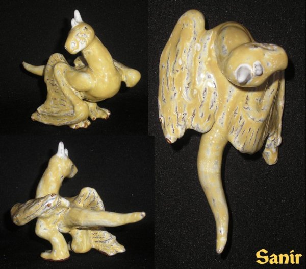 Ve třeťáku jsme měli volnější hodiny, učitelé nám nechtěli zadávat velké práce, což mě mrzelo, jelikož mě vždycky bavili. Při jedné hodině, když jsem měla všechno hotové jsem si řekla že si vyrobím malou sošku wyverna. Při glazování jsem byla nucena udělat pokus s glazurami, protože žlutého barvítka, kterým jsem ho chtěla odekorovat bylo málo. Pokus dopadl velmi dobře.
