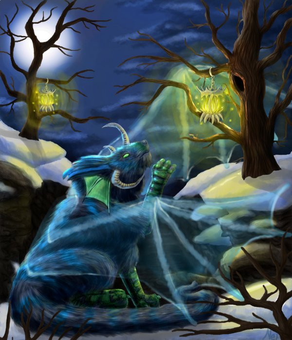 Opravdu obrázek s parádní atmosférou - celek působí hodně tajemně skoro až magicky. Musím říct, že spíš než z příšerky (u které mi trošku nesedí ta průhledná křídla) jsem naprosto unešená z lucerniček, stromů a měsíce. Je sice pravda, že to je "jen" pozadí nicméně dovedené takřka k dokonalosti. Každopádně myslím, že tohle dílko se bude v kalendáři vyjímat naprosto luxusně