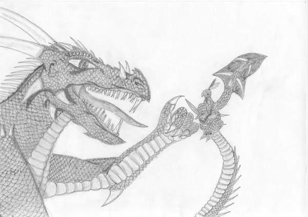 Hehe, jak je ten rytíř pěkně ovinutej koncem ocasu, to je super. A ten výraz draka, jako učitel hrozící žákovi. Šupiny jsou moc povedený, ale ten výraz je prostě skvělej!!