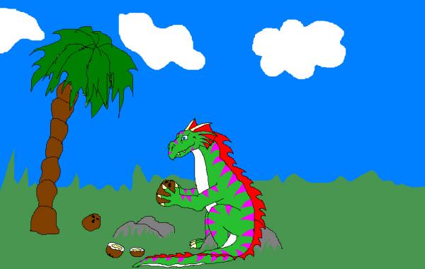 Drak s palmou a kokosy...kresleno v programu malování ( Omlouvám se za to rozmazání :( , ale když si ten obrázek zvětšíte, tak je normální... )