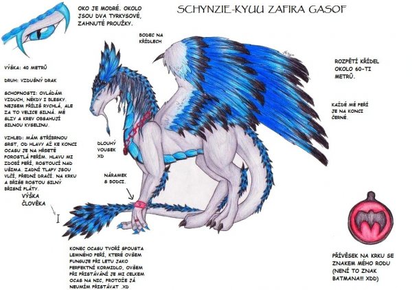 protože anatomii zatím taky neovládám, tak se k ní vyjadřovat nebudu. Tvoje velikost je tedy ohromující. Na první pohled mě zaujalo křídlo. To peří je moc pěkné, celkově barva tvého charu je příjemná a sympatizující s prostředím, ve kterém žiješ. Trochu nerozumím tomu, že v letu nejsi rychlá a neumíš dobře přistávat, když jsi vzdušný drak - ?? Jinak se mi moc líbí dlouhá pera na hlavě a vousek. A nakonec celé tvé jméno je taky moc pěkné.