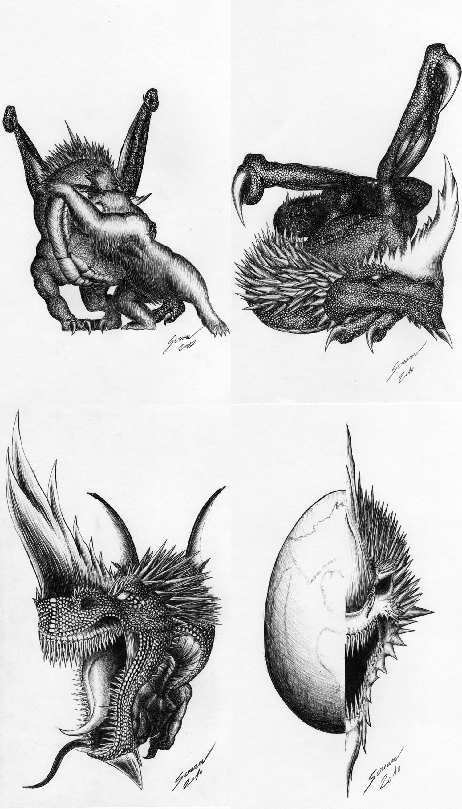 No je pravda že medvěda jsem zkoušel oprvně tak to neni ještě úplně ono... :-) A na tom třetím jsem se pokoušel trošku perspektivy vyrobit taky... Hlavu vpředu podloženou packou a pak volným ohybem s bodlinami k ramenům a křídla podél stáčejícího se trupu dozadu (postupně tmavnoucího) a pak křídla zase zpět dopředu:-)