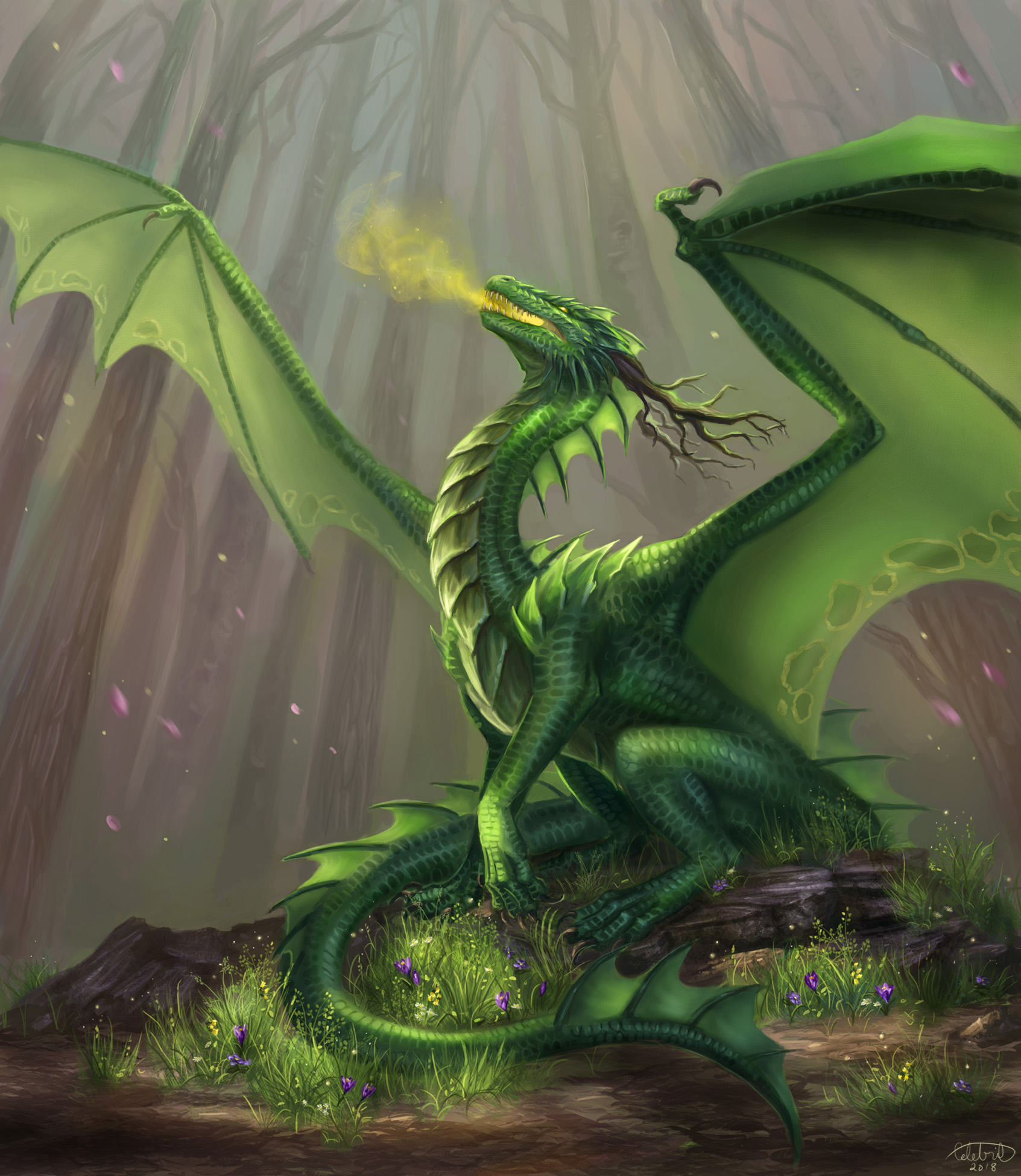 Môj tohtoročný príspevok do kalendára. Obrázok má zachytávať obdobie po zime, keď je les ešte šedohnedý a zelený drak - posol jari - svojou prítomnosťou a silou spôsobuje prebudenie prírody. ^^