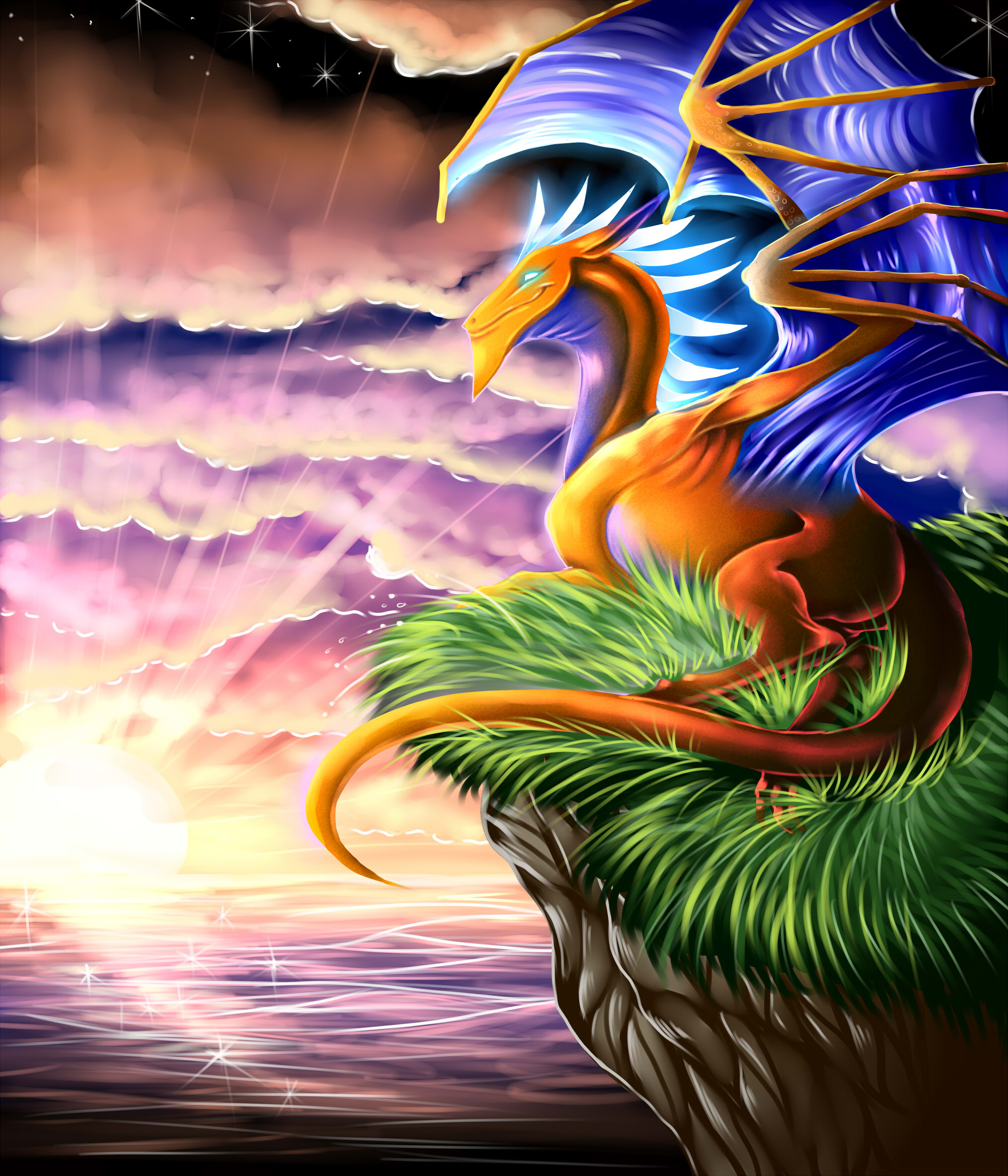 taky mi tam vadi ty hvezdicky na hladine, ale i ty na nebi a i paprsky, jednak se mi tam nehodi, druhak mi neprijdou udelane moc peclive. pak mi vadi nebe. kdyz je slunce jeste videt, tak rozhodne neni takto tmava obloha a hvezdy. ze je to nerealne, neni samo o sobe problem, ale tady mi prijde, ze to ve spojeni s jasnymi ruzovymi mraky ani nevypada dobre. obecne mas na obrazku vsechno hodne sytymi barvami a vsechno leskle, zkus pouzivat mene syte barvy, treba pri zapadu slunce casto vidime na nebi fialovou, ale ve skutecnosti je to seda. taky nemusi vsechno zarit, lesknout se a blystet, vyber si jenom nejakou dulezitou oblast a tu udelej vyraznou.