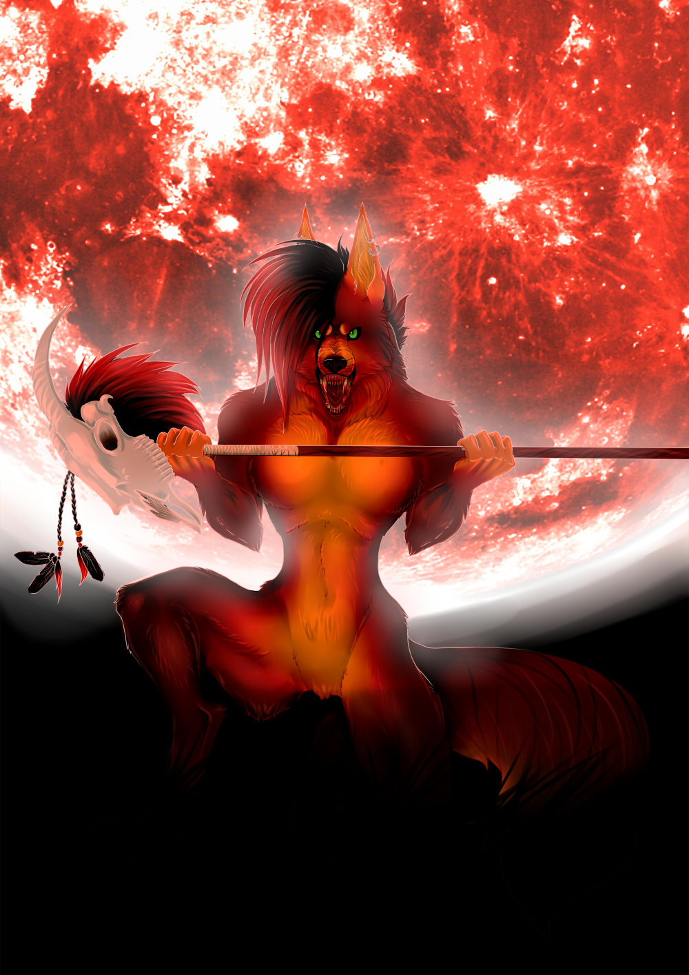 Moc se mi líbí hůl s lebkou a taky hlava vlkodlačí(?) potvůrky. Co mě ale docela mrzí je ta černota - myslím si, že by mohlo vypadat lépe, kdybys ji prokreslila a nenechala takhle jednolitě tmavou. Vidím sice náznaky trávy, ale to se musím jó snažit. :D Celkově mi obrázek přijde... jak to popsat... řekněme výrazný. Osobně sice nejsem fanda takovýchto typů těl s obrovskými svaly a úzkým pasem, nicméně to je spíš otázka vkusu. :D