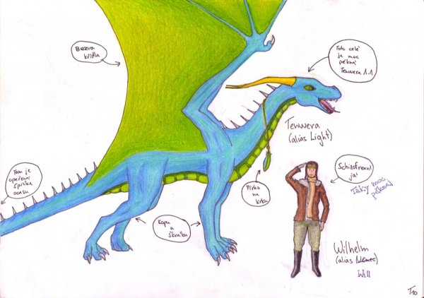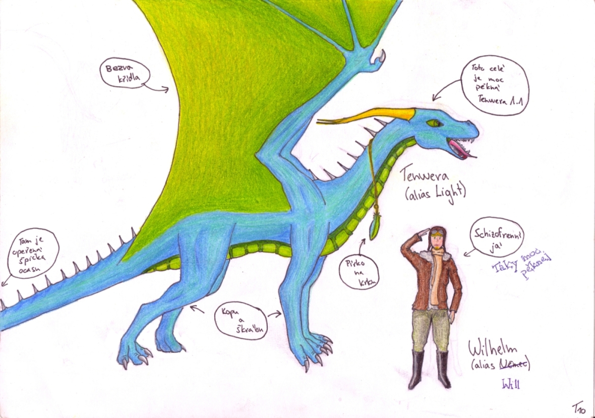 moc pěkné :). Líbí se mi hlavně ta barevná kombinace, která neni obvykle moc dobře pochopená a oblíbená. Modro-zelená. Někomu se to k sobě absolutně nehodí, přitom nechápu proč. To by se jim nemohl líbit pohled na travnatou louku s modrým nebem, který je jinak úplně normální a častý. Tak jsem ráda, že nejsem sama, komu se tahle kombinace líbí :). Máš tu hezké pestré barvy, dál docela hezky působí, jak jsi do modré dala i trochu zelených tahů. Ikdyž podle mě by byly spíš fajn celkově silnější stíny na celém obrázku... Docela mě zaujaly ty břišní pláty, připomněly mi takové ty krunýře želv Ninja :D. Díky té bílé čárce působí docela prostorově, to je fajn... Jinak pokud šlo o zachycení celé podoby, myslím, že by bylo lepší tam dát opravdu celou podobu. A peříčko na kkku se ti náhodou povedlo, jen se neboj pro příště nakreslit i ten ocas. A pokud si nebudeš jistá, přece neni žádný hřích se inspirovat fotkami peří ptáků a překreslit to z toho :). Jinak myslím, že anatomicky ti to jde docela dobře, možná bych se zaměřila na nášlapné části končetin. Přední nemají žádné zápěstí a nevím, jestli tak velké stvoření by udržely jen takhle špičky prstů. Jinak ale celkově stavba vypadá dobře a ty drápky jsou taky roztomilé. Poslední, co bych na dračici našla, tak snad jen tu čelist. Hlava je normálně z profilu, ale dolní čelist naproti tomu natočená vnitřkem k nám. Jinak ale chválím a rozhodně tyhle chybky nekazí dojem z celýho obrázky, který je alespoň pro mě velmi příjemný... Jinak schízu ti nezávidim, někdy umí být děsně otravné, jsem ráda, že jsem se jich zbavila :D. Tak přeju, ať moc neremcá... Pěkný obrázek ;)