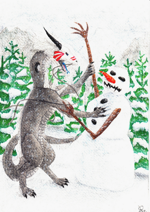 To je dobrý obrázek. Ten sněhulák vypadá jako by se opravdu bránil. Moc hezky nakreslený.