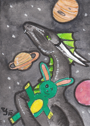 Králík je bezva:-) Možná, že se leckkomu bude zdát, že je malý kontrast mezi pozadím a dračicí...ale mě se to právě tak líbí. Myslím, že to dost oživují ty dva odstíny zelené a ty šišaté planetky