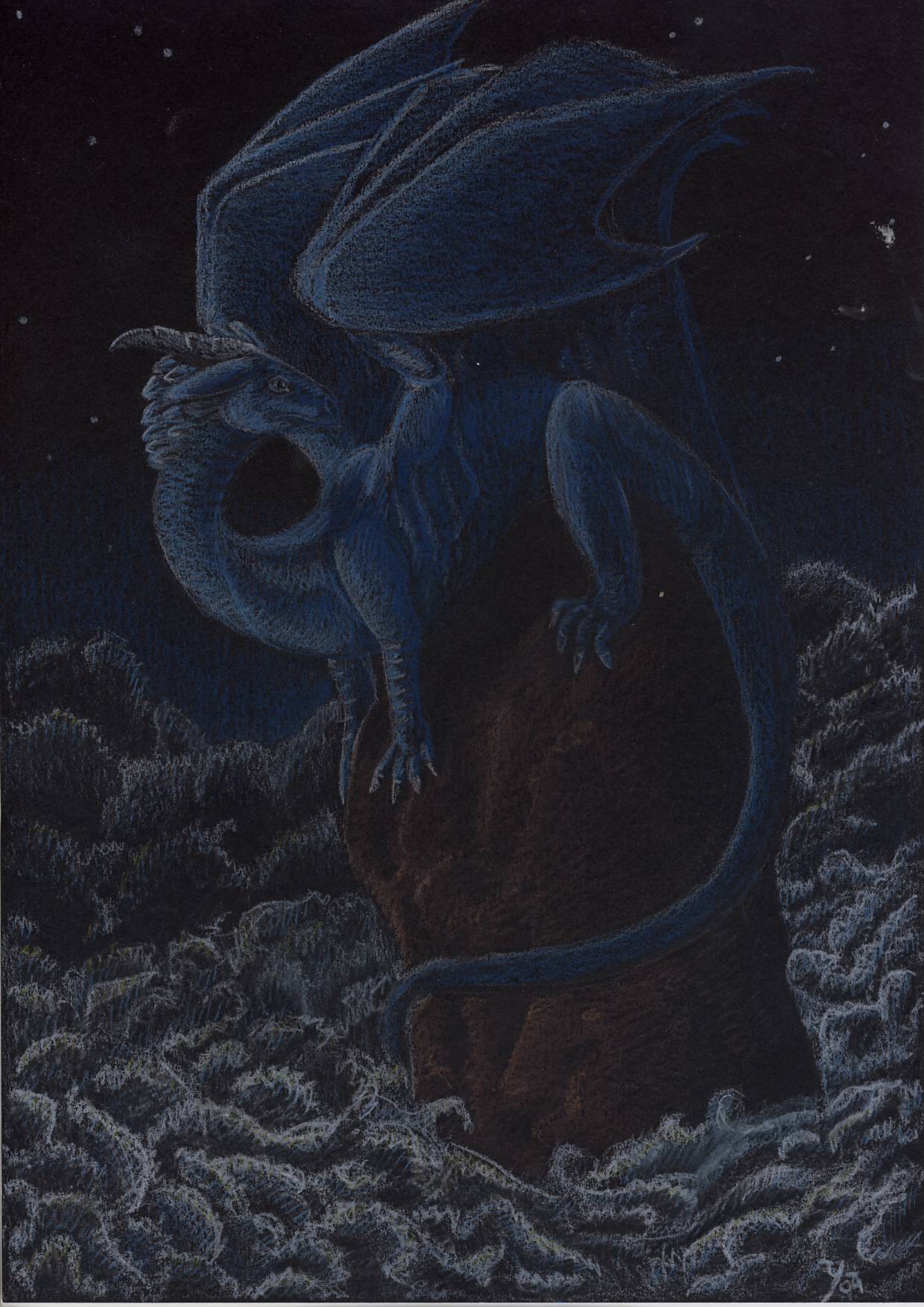 Moc se ti obrázek povedl.Hvězdná obloha.To vypadá jako místo kde skončil Draco.Hlavně se mi líbí to spojení černého papíru a pastelek.