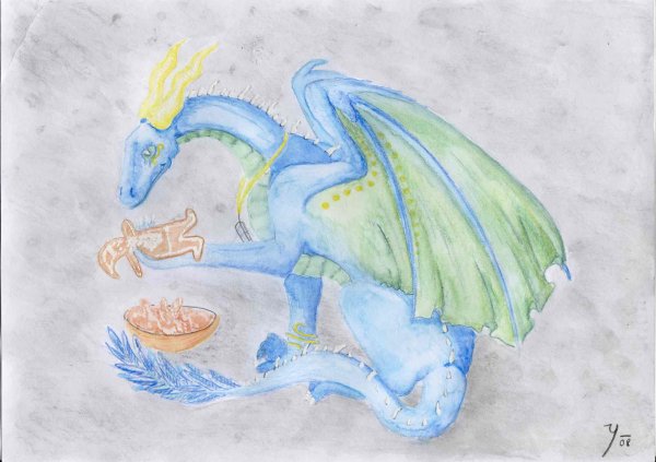 K samotné technice mohu jen dodat, že jsem použila akvarelové pastelky (a konečně pochopila, jak se rozmývat, aby to vypadalo aspoň trochu rozumně). S pozadím jsem si nevěděla rady, tak to dopadlo, jak to dopadlo a na tomhle scanu chybí písmeno F, které má Tenwera na zadní noze, na originálu už je, jak jistě může Tenwera potvrdit :-)