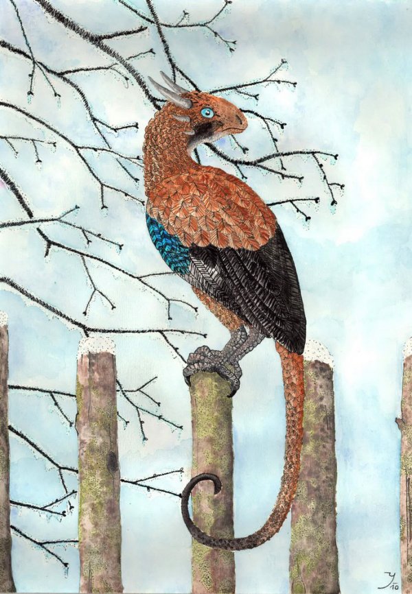 Vyvedenej ptáček. Vskutku. Zajimavě jsi stvárnila draka do dračí podoby. Ta modrá "pírka" jsou luxusní. Nepřehlédnutelný znak pro sojku.