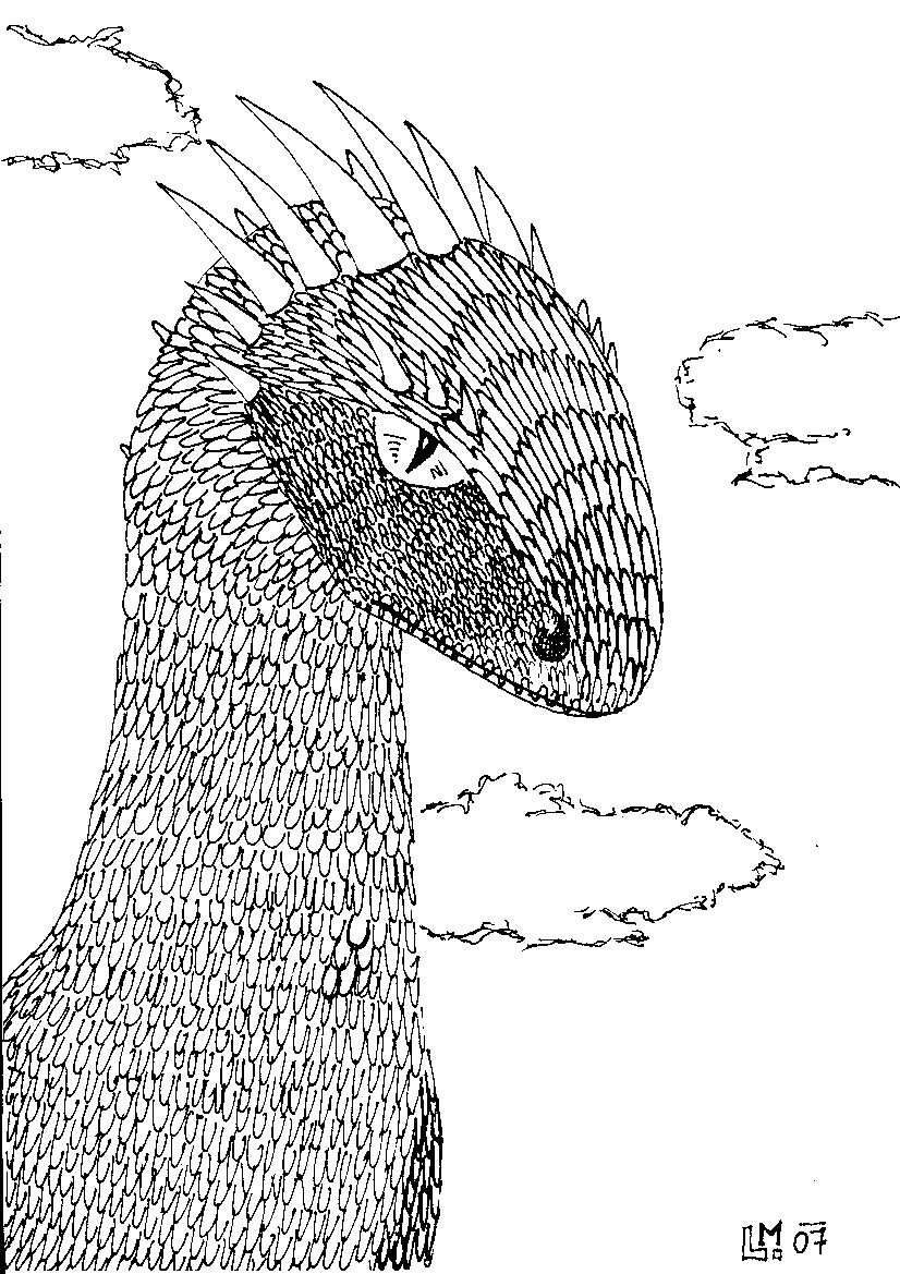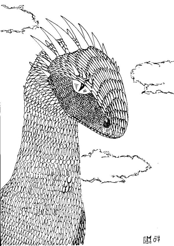 Celkem pěkný dráček. Ta hlava je povedená a přijde mi i originální. Ale ten krk, jak už říkala Chir, by chtěl trošinku lepší pečlivost. Tam ty šupiny oproti tý hlavě působěj chvílema trochu odflinkle... a ještě možná by bylo pěkný naznačit nějaké stíny nebo něco na těch ostnech, aby nevypadaly tak syrově (jestli víš, jak to myslím